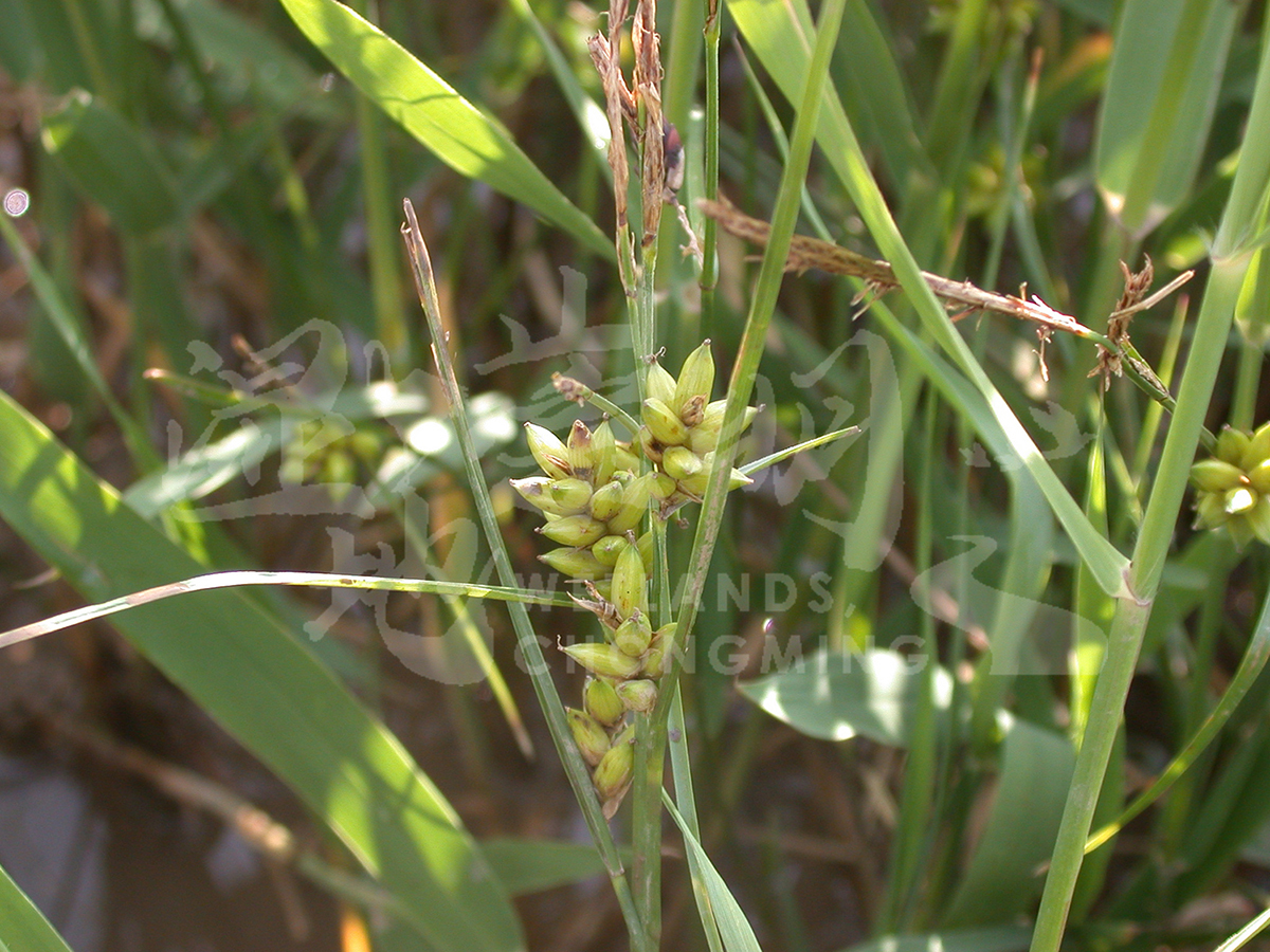 多年生草本。匍匐茎横走。秆簇生,直立,高30-60厘米,三棱形,上端稍粗糙。叶质坚挺,中间具沟或边缘稍内卷,边缘粗糙,略内卷。苞片下面的叶状,长于花序,上面的近鳞片状。小穗3-5个,上端的2-3个小穗为雄小穗,间距短,狭圆柱形;其余1-2个为雌小穗(偶有混生雄性小花),间距较长些,长圆形,具较密生的10-15朵花。雄花鳞片倒披针形;雌花鳞片宽卵形,具3条脉。果囊斜展,长于鳞片,鼓胀三棱形,顶端急狭成短而稍宽的喙,喙口呈半月形微凹,具两短齿。瘦果紧密地为果囊所包裹,钝三棱形;花柱基部稍增粗,柱头3个(偶有1或4个)。花果期4-7月。 |