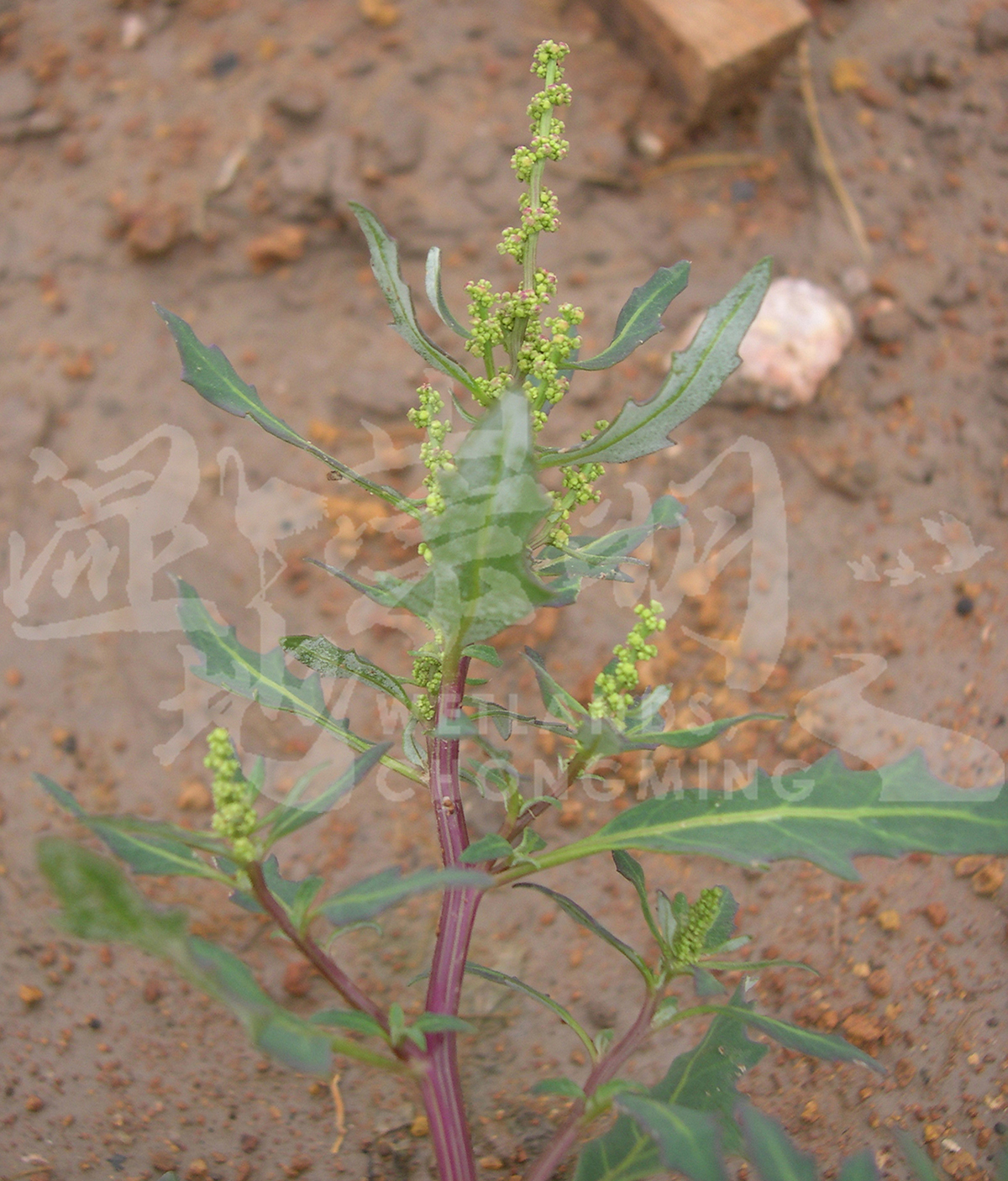一年生草本,高20-40厘米。茎匍匐或铺散,自基部分枝;分枝平卧或上升,具条棱和绿色或紫红色条纹。叶片长圆状卵形至披针形,基部渐狭,边缘有波状牙齿,先端急尖或钝,肉质,下面具灰白色粉末,有时稍紫红色。数朵花聚成团伞花序,再于分枝上排列成穗状或圆锥状花序;花两性兼雌性;花被裂片3-5,肥厚,浅绿色;雄蕊1-2,花丝不伸出花被;柱头2,极短。胞果顶端露出花被外,果皮膜质,黄白色;种子横生,稀斜生,扁球形,暗褐色或红褐色,表面有细点纹;胚环形。花果期5-10月。 |