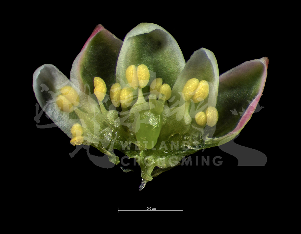 一年生草木,高10-40厘米。茎平卧或上升,自基部多分枝,具纵棱。叶有极短柄或近无柄,基部具关节;叶片披针形或狭椭圆形,长1-4厘米,宽3-12毫米,基部楔形,全缘,顶端急尖或钝圆,两面无毛;托叶鞘膜质,下部褐色,上部白色,具脉纹。花1-5,簇生于叶腋,遍布于全植株;花梗细而短,顶部有关节;花被5深裂,裂片椭圆形,绿色,边缘白色或粉红色;雄蕊8,花丝基部扩展;花柱3,柱头头状。瘦果包于或稍超出宿存花被,三棱状卵球形,黑褐色,密被不明显小点,无光泽。花期5-9月,果期6-11月。 |
