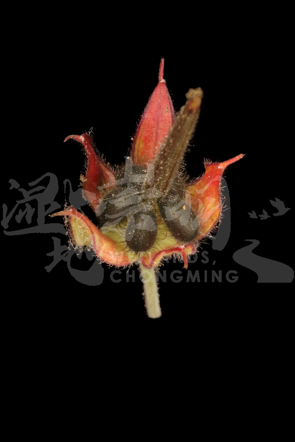 一年生草本,高10-65(-70)厘米。茎直立,具棱角,密被0.2-1.1毫米长的直立至倒生无腺毛,散生有0.2-0.7毫米的直立具腺毛。茎下部叶具长柄,上部叶柄渐短;叶1-3互生,但在花序上对生;叶片圆肾形,长2-3厘米,宽4-6厘米,掌状5-7裂至基部,基部心形,先端急尖,上面被短伏毛,下面沿脉被短伏毛;基生叶早枯;托叶披针形或三角状披针形。聚伞花序伞形,密聚集于每个枝顶;小苞片披针形;萼片长卵形或近椭圆形,背面被向上至直立毛及直立腺毛;花瓣淡紫红色,倒卵形,基部宽楔形,先端圆形或有微缺;雄蕊稍短于萼片,花丝顶端急剧变窄,具疏毛,中部以下被纤毛;雌蕊稍长于雄蕊,密被糙柔毛。蒴果长约2厘米,果皮密被0.5-1.8毫米的无腺或有时为具腺绒毛,成熟时果瓣由喙下部先裂向上卷曲。种子长椭圆形,黑褐色,表面具网纹。花期4-7月,果期5-9月。 |