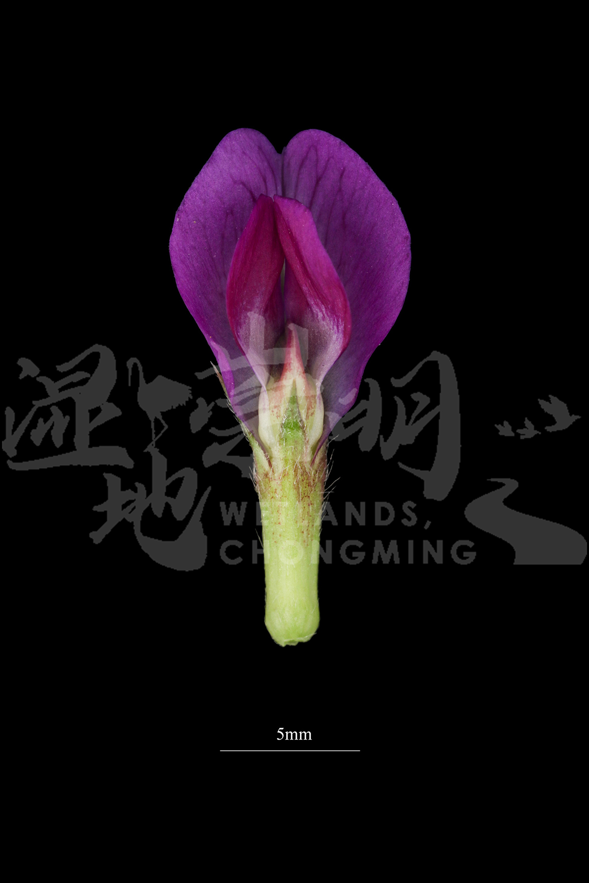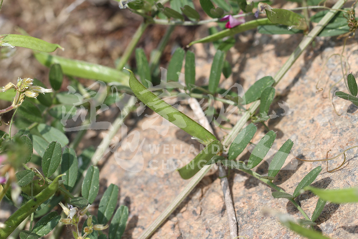 一年或二年生草本,高20-50厘米。茎斜升、蔓生或攀援,具棱,被疏柔毛,多分枝。偶数羽状复叶;小叶2-8对,条形至长圆状楔形,先端锐尖、钝或截形,有细尖,基部楔形,两面疏生黄色柔毛;托叶戟形;卷须发达,有2-3个分支。花1-2朵生叶腋;花萼钟状,萼齿5,披针形,渐尖,有白色疏短毛,萼齿短于萼筒;花冠紫色或红色;二体雄蕊;子房条形或纺锤形,无毛或被微柔毛,柱头背部有淡黄色鬃毛。荚果条形,扁平,黑色或黑褐色,种子间不收缩,常无毛;种子棕色,圆球形。花期3-7月,果期3-9月。 |