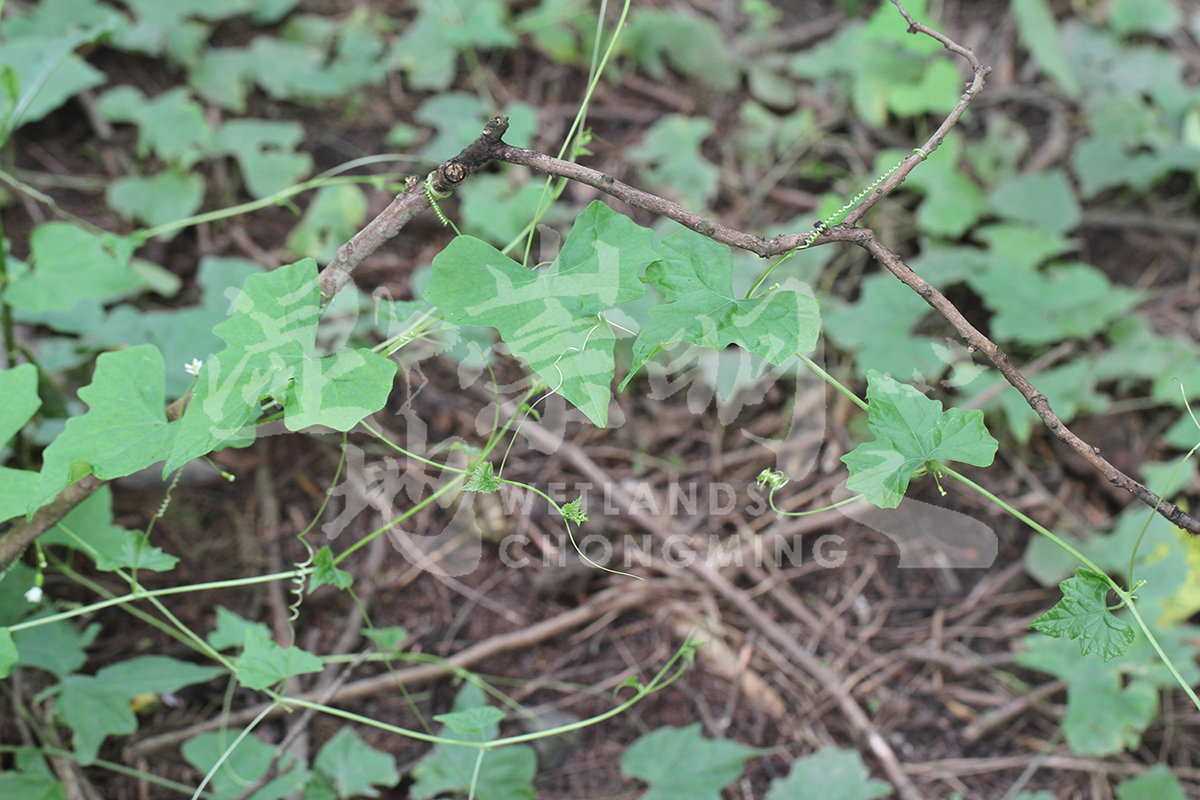 攀援或平卧草本,雌雄同株。茎纤细,有棱沟。叶柄细,2.5-3.5厘米;叶多形,三角状卵形、卵状心形或戟形,不分裂或3-5浅裂,基部弯缺半圆形,边缘微波状或有疏齿,顶端急尖或稀短渐尖,上面粗糙,深绿色,下面无毛,浅绿色,脉掌状,膜质。卷须单一。雄花单生或2-3朵排成短的总状花序;雌花单生或稀双生于雄花同一叶腋内;花冠淡黄色;雄蕊3,生于花冠基部,花丝短;子房狭卵形,有疣状凸起,花柱短,柱头3裂,退化雄蕊腺体状。果实长圆形或渐狭卵球形,两端钝,外面无毛,长1-1.5厘米,宽0.5-0.8厘米,成熟后橙色或红色。种子灰白色,卵形,基部稍变狭,边缘不明显。花期4-7月,果期7-10月。 |